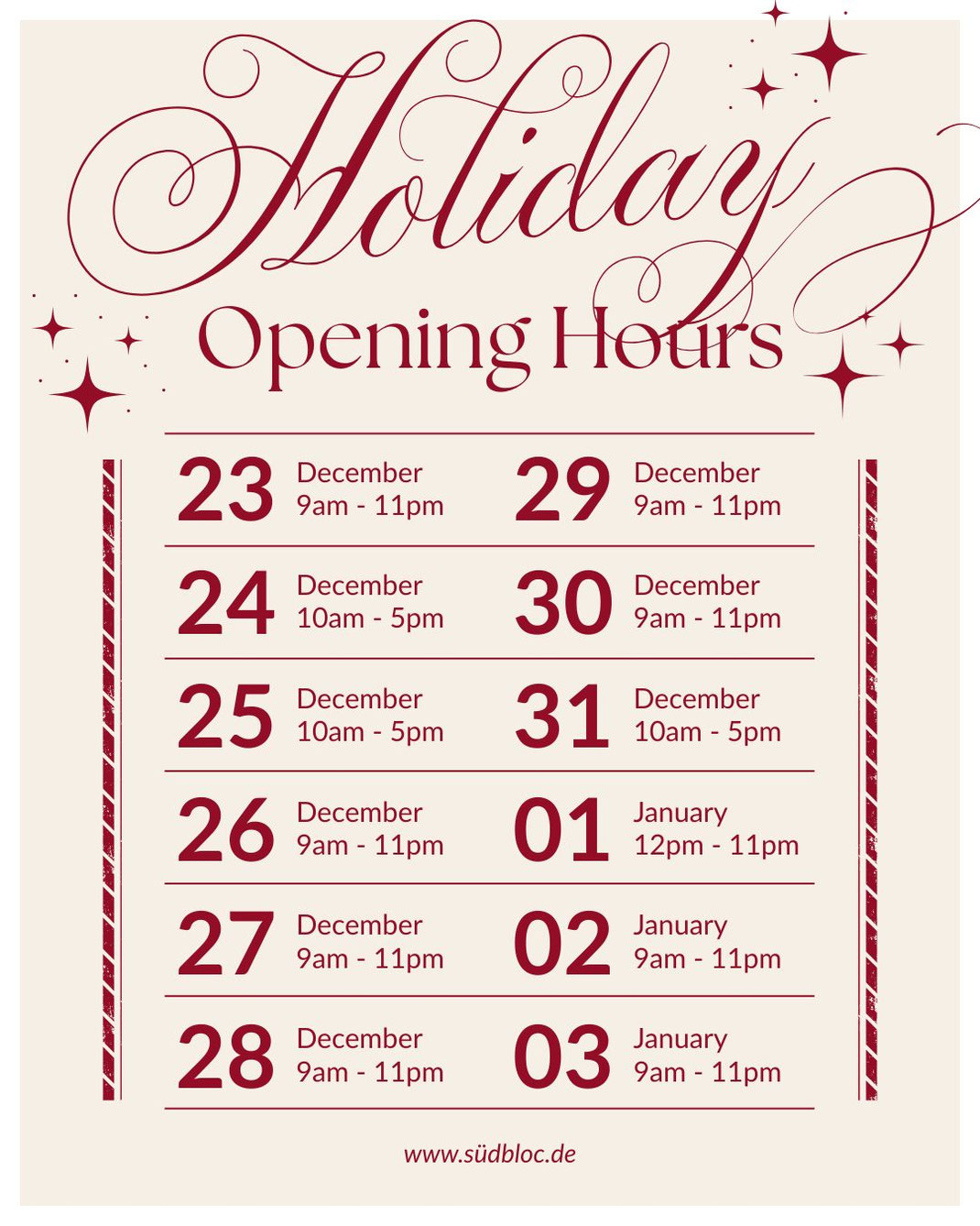 Unsere Öffnungszeiten über die Feiertage